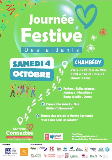 À l’occasion de la Journée nationale des aidants, Bulle d’Air® Alpes du nord vous donne rendez-vous pour une journée festive et solidaire à Chambéry, aux côtés de nombreux partenaires* engagés pour les aidants.